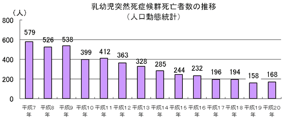 | ・ | 乳幼児突然死症候群(SIDS)対策強化月間を開始した平成11年度以降、この病気で亡くなる赤ちゃんの人数は半数以下に減少しています。 |