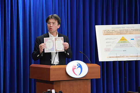 おはようございます。今日はお集まりいただきましてありがとうございます。先日、厚生労働科学研究の研究代表者の筑波大学の朝田隆教授から、「都市部における認知症有病率と認知症の生活機能障害への対応という研究報告」を、厚生労働省にいただいたところでございます。おかげさまで、特に新聞、テレビ含めて、ずいぶんメディアに取り上げていただき、本当に感謝をしております。私もこの認知症問題、かねてから大変大きな課題だというふうに認識をしておりまして、いずれこの記者会見でも現況やこれからの取組、課題について、皆さんにお伝えする機会を持ちたいと思っておりましたので、ちょうど良いタイミングでの報告だなと思っておりました。前回、いろいろな、私もなるべく現場の視察をしっかりとさせていただこうというふうに常日頃から考えておりまして、ちょうど名古屋にございます独立行政法人国立長寿医療研究センターの大島先生のところにもお伺いをして、アルツハイマー治療の現状と最先端の知見をヒアリングしてきたところでございますし、大島先生には御案内のとおり、社会保障制度改革国民会議の委員もお務めをいただいておるわけでございまして、大変先般有意義な議論もさせていただいてきたところでございます。今日はそういうことで、認知症の人に対する介護サービスの充実はもちろんですけれども、今後新たに進める必要がある取組について、説明をさせていただきたいと思います。皆様のお手元には資料を2部配布させていただいております。今日パネルで説明する内容のものとですね、それからもう1部はカラー刷りになっているかどうかわかりませんが、認知症を患う人を支える家族の課題ということで、これはまさに国立長寿医療研究センターでオリジナルで作っているやつなんですね。やはり、家族の誰かに認知症が発症をした方が出ますとね、対応が戸惑うわけですね。そういう家族の皆さんに、それぞれの診療所、病院ではですね、インタビューといいますか、ヒアリングを中心に個別での適切な対応をやっていただいてますけれども、一応こういう書式としてですね、まずこれをお読みくださいという形で、非常にこれ良く、これは冊子でできているものでございまして、良くできているんじゃないかなと。家族がこれを見れば、大体認知症についての状況っていうのが体系的に理解されるんじゃないかということで、こういう冊子もですね、独法ではありますけれども、国立の病院で作成したものでございますから、こういったものを広く診療所、関係機関でもお使いをいただいてですね、このアルツハイマー、認知症の問題というものが、より理解が進んでいくということが大変大事だというふうに思っておりますので、皆様も是非こちらのパンフレットはですね、いろいろなところで、周知をしていただければ大変ありがたく思います。