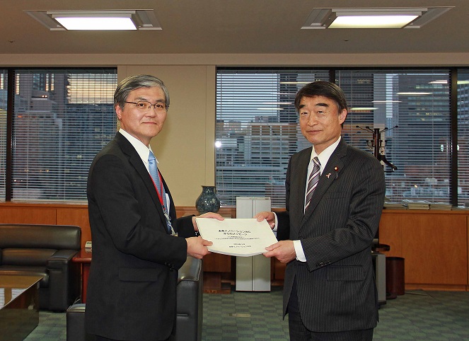 佐久間座長から中間取りまとめ報告書を受け取る根本厚生労働大臣