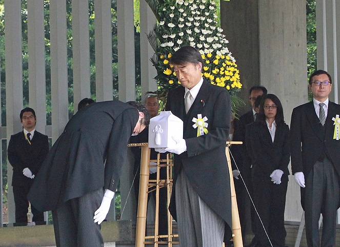 千鳥ヶ淵戦没者墓苑拝礼式で納骨するご遺骨を受け取る根本厚生労働大臣