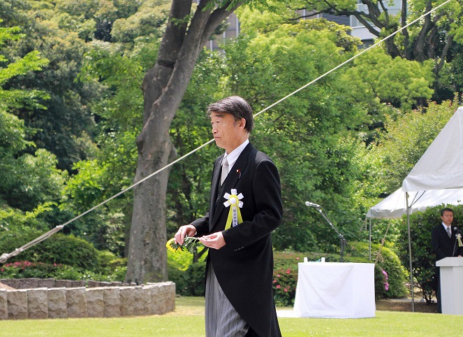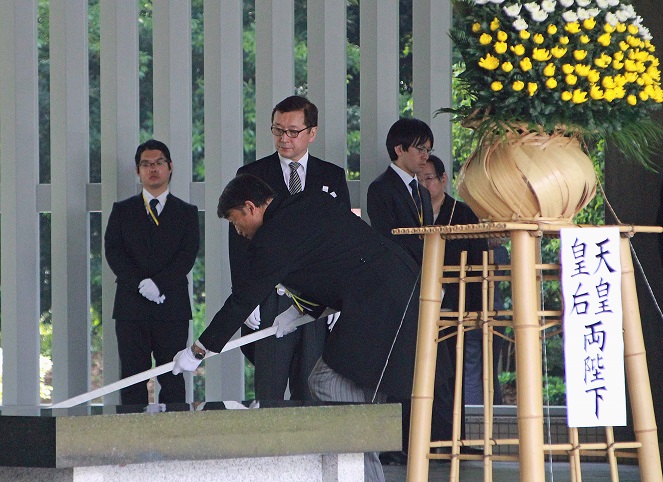拝礼式には約600人が参列し戦没者に拝礼を行うとともに、安倍内閣総理大臣の代理である菅内閣官房長官をはじめ、遺族代表(日本遺族会会長含む)、関係国駐日大使、衆議院議長、衆議院厚生労働委員長、外務大臣、環境大臣、防衛大臣、各政党代表、各関係団体代表が献花を行いました。