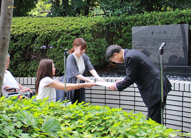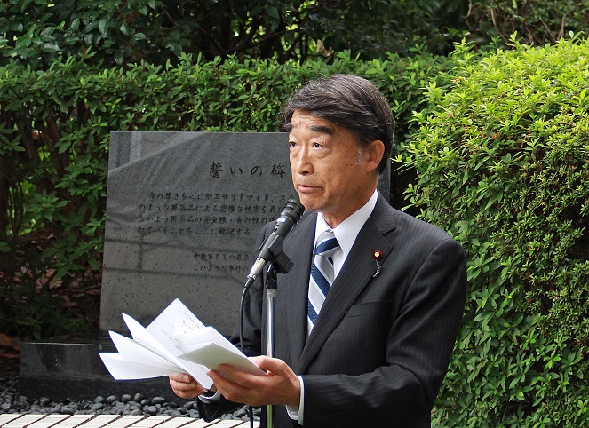 「『誓いの碑(※)』の趣旨を改めて心に刻み、私をはじめ、医薬行政に従事する厚生労働省の職員一人ひとりが、その職責の重さを忘れることなく、医薬品の品質、有効性と安全性の確保に最善の努力を重ねてまいります」