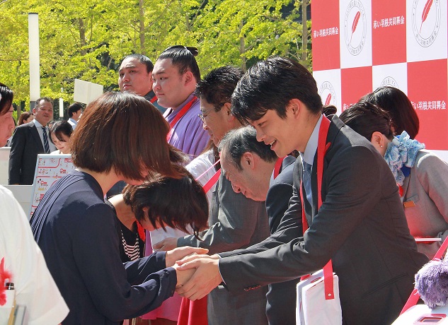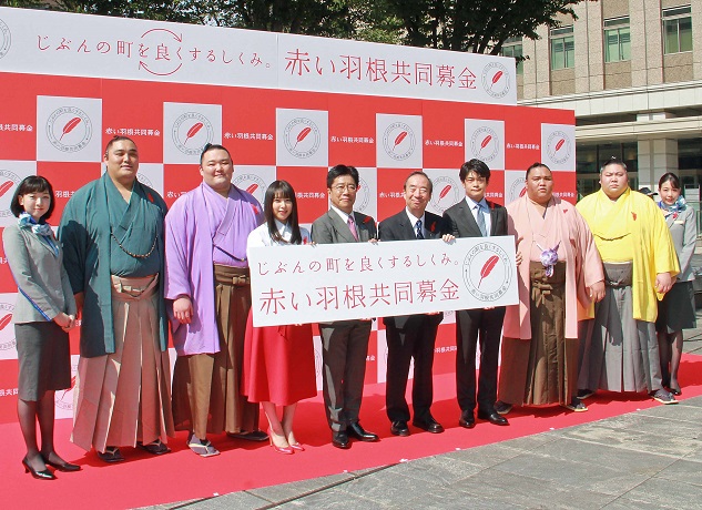 イベントの中で、加藤厚生労働大臣は、清家中央共同募金会会長、女優で赤い羽根サポーターの桜井日奈子さん、NHK大河ドラマ「いだてん」に出演している井之脇海さん、大相撲秋場所三賞受賞力士 御嶽海関(幕内優勝、殊勲賞)、朝乃山関(殊勲賞)、隠岐の海関(敢闘賞)、剣翔関(敢闘賞)、ANAグループ客室乗務員らと共に街頭募金への協力を呼びかけました。