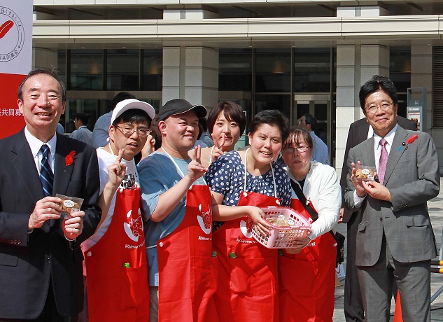 募金にご協力いただいた方にクッキーをご提供していただいた台東区の福祉施設の皆さまと清家中央共同募金会会長と加藤厚生労働大臣