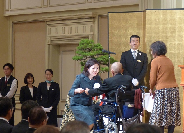 被表彰者に表彰状を贈る自見厚生労働大臣政務官