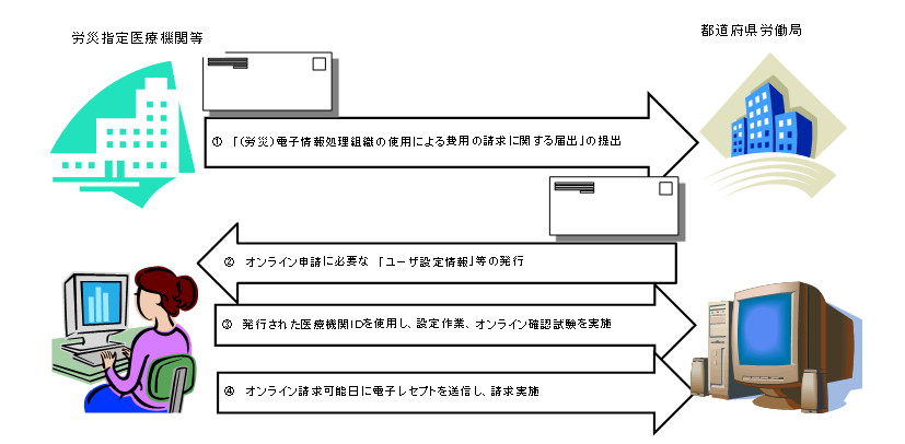 オンラインによる請求を行う場合には、「(労災)電子情報処理組織の使用による費用の請求に関する届出 [24KB]」(※2、3)に必要事項を記載し、都道府県労働局に提出してください。