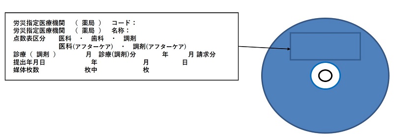 労災指定医療機関(薬局)コード、労災指定医療機関(薬局)名称、点数表区分、診療(調剤)月分、提出年月日及び媒体枚数を記載してください。