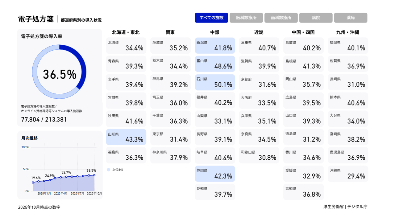 都道府県ごとの導入状況や電子処方箋管理サービスへの調剤結果登録割合、重複投薬等チェックの実行件数、アラート件数を図やグラフで表したダッシュボードを公開しています。