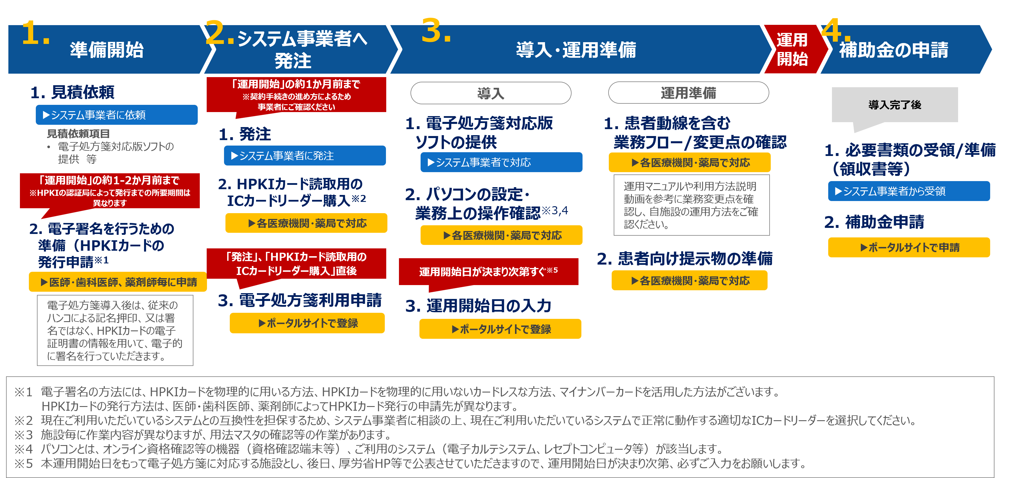 ・補助金の申請方法は、医療機関等向け総合ポータルサイトの電子処方箋管理サービス等関係補助金の申請について※をご確認ください。