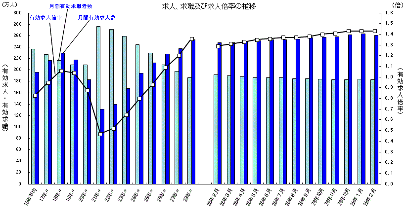厚生労働省では、公共職業安定所(ハローワーク)における求人、求職、就職の状況をとりまとめ、求人倍率などの指標を作成し、一般職業紹介状況として毎月公表しています。