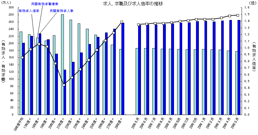 厚生労働省では、公共職業安定所(ハローワーク)における求人、求職、就職の状況をとりまとめ、求人倍率などの指標を作成し、一般職業紹介状況として毎月公表しています。