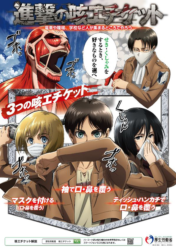 厚生労働省は、咳エチケット(せきエチケット)の啓発のために、『進撃の巨人』とコラボレーションし、ポスター・リーフレットの作成と、SNSなどを通じた情報発信を行います。