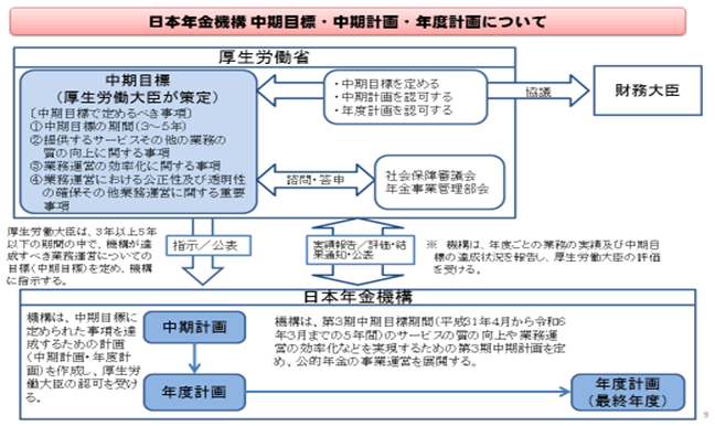 具体的には、厚生労働省が定めた中期目標に基づき、日本年金機構は中期計画及び各年度の年度計画を策定し、これらに基づいて計画的に業務を行っており、日本年金機構は事業年度ごとの業務の実績について報告し、厚生労働大臣が評価を行っている。また、社会保障審議会年金事業管理部会において、中期目標及び業務の実績評価を諮問している。