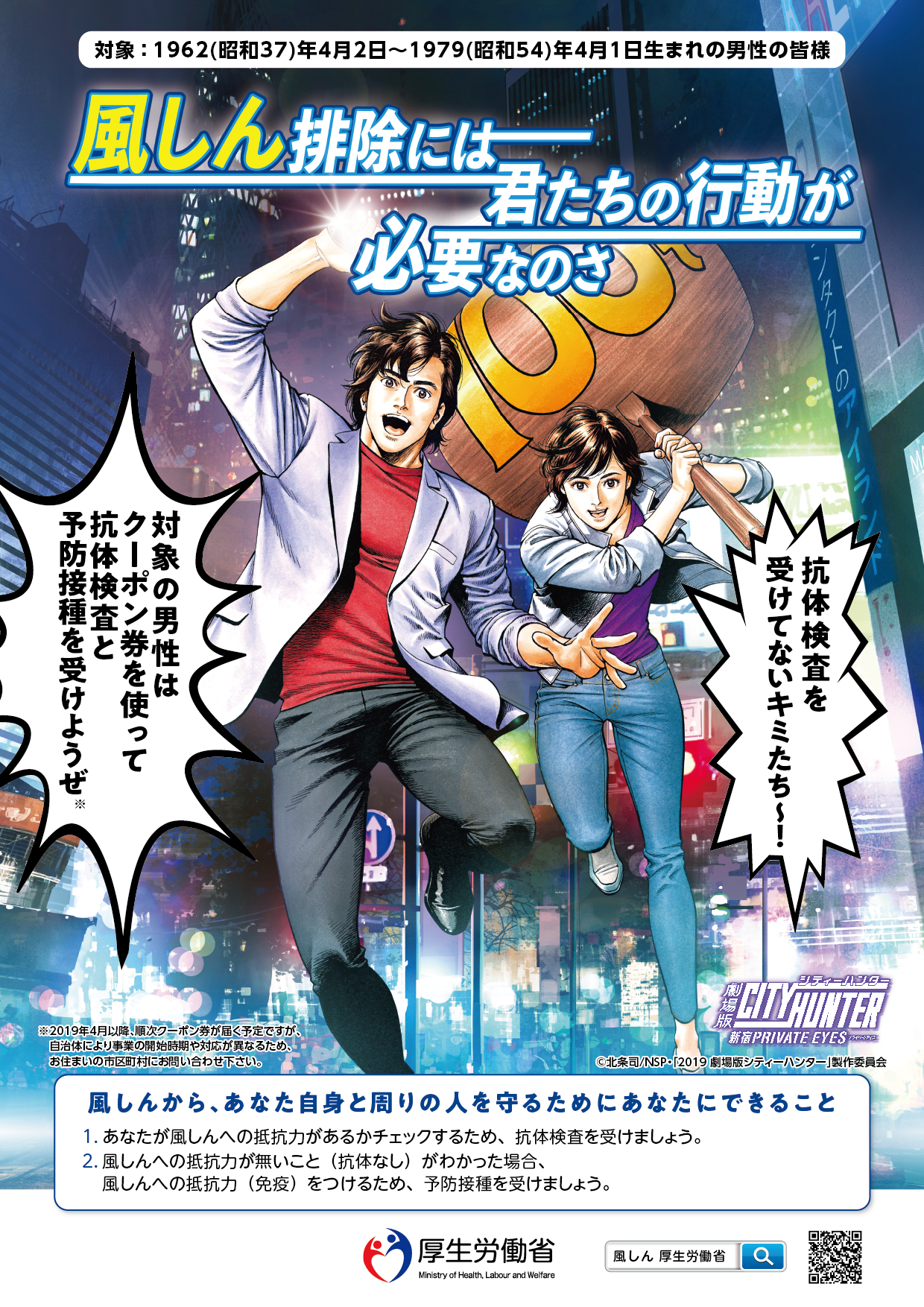 風しんに関する追加的対策について、より多くの対象男性(1962(昭和37)年4月2日~1979(昭和54)年4月1日生まれの男性)に対して告知し、抗体を獲得してもらうために、厚生労働省は「劇場版シティーハンター <新宿プライベート・アイズ>」とコラボレーションしたポスター及びリーフレットの作成や、SNSなどを通じた啓発活動を行います。