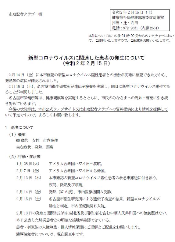 本日(2月15日)、名古屋市より、今般の新型コロナウイルスに関連した感染症の症例が、以下の通り報告されましたので、ご報告いたします。