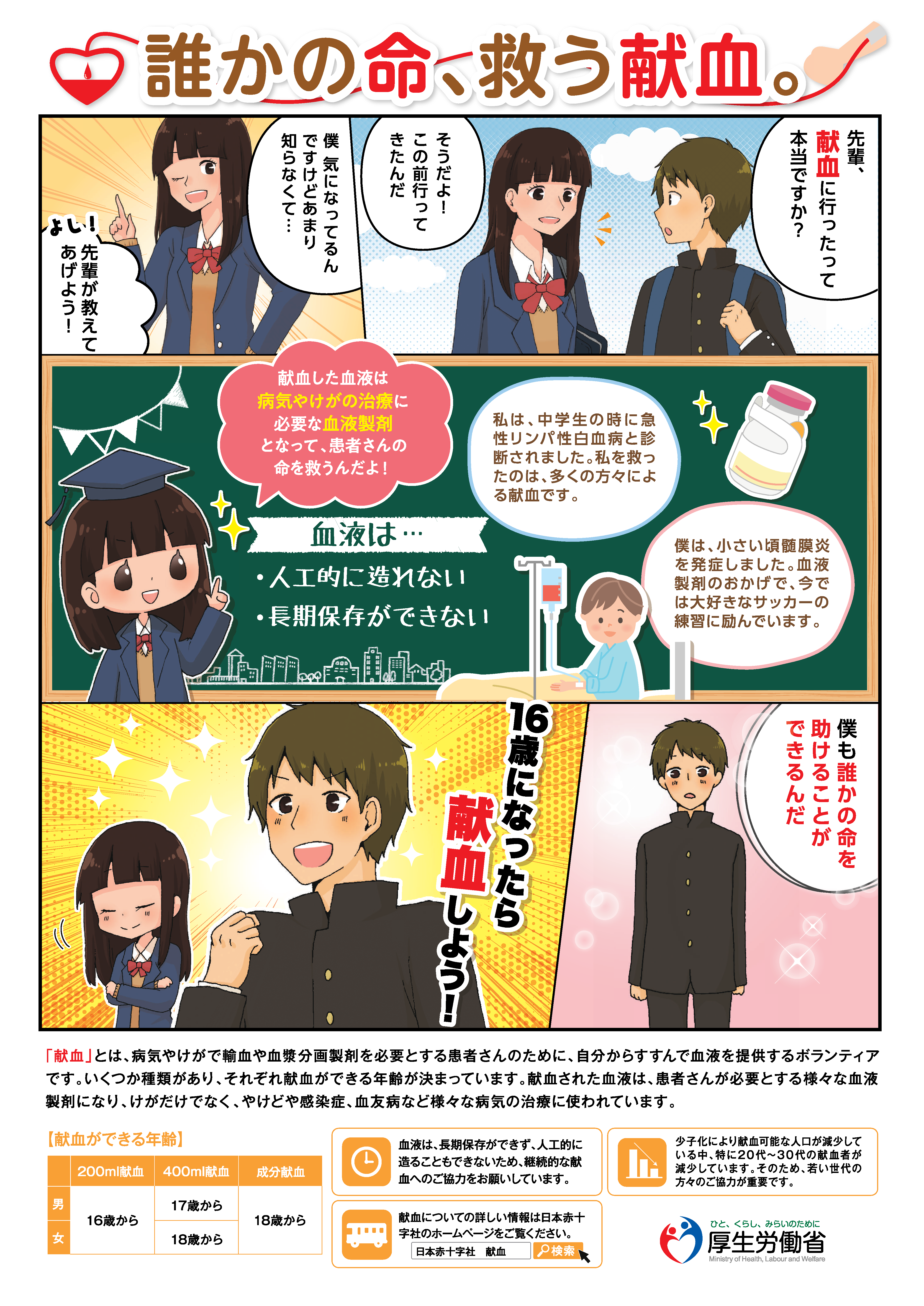 厚生労働省では、例年、若年層に対する献血の普及啓発の一環として、中学生を対象とした献血への理解を促すポスターを作成しています。