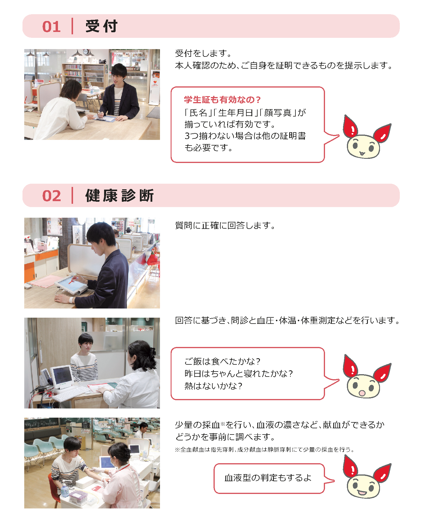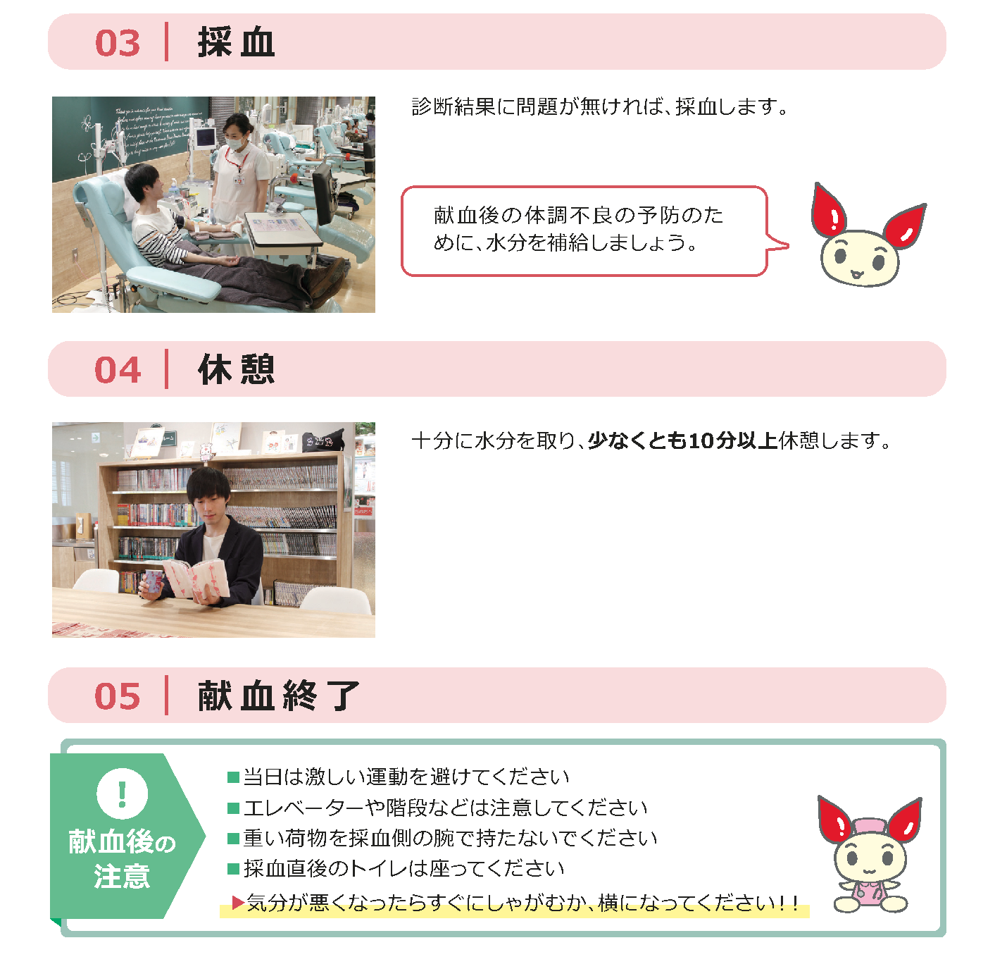 全血献血は、血液中のすべての成分を採血する方法で、200mL献血と400mL献血があります。成分献血は血液中の血小板や血漿だけを採血する方法で、血漿成分献血と血小板成分献血があります。