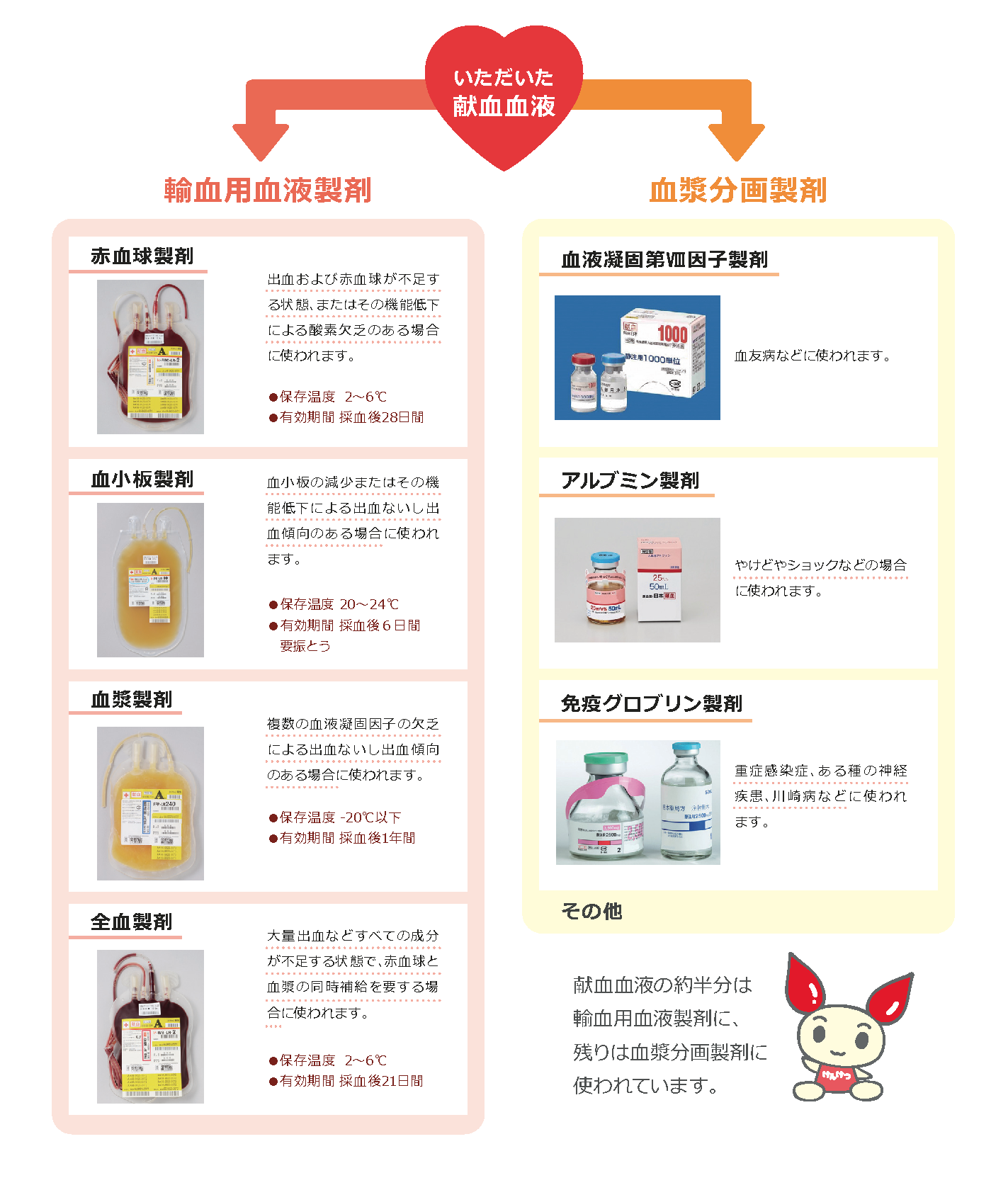 献血は無償で血液を提供するボランティアです。献血によりいただいた血液から、輸血用血液製剤や血漿分画製剤がつくられ、病気やけがの患者さんの治療に役立っています。血液は人工的につくることができず、また、長い期間保存することもできません。