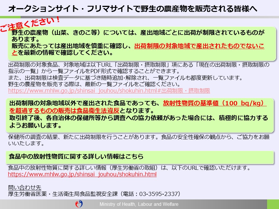 このたび、インターネットオークション、フリーマーケットアプリ等において、食品衛生法に定める食品中の放射性物質の基準値(100 Bq/kg)を超過する野生の山菜が販売される事例が確認されています。