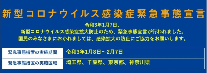 1/8~2/7(31日間)を期間として、埼玉県、千葉県、東京都、神奈川県(1都3県)を対象に、緊急事態宣言が行われました。