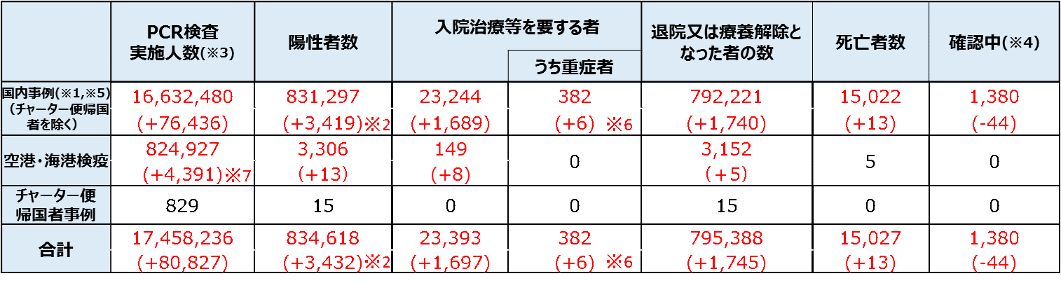 ※7:令和2年7月29日から順次、抗原定量検査を実施しているため、同検査の件数を含む。なお、空港・海港検疫の検査実施人数等については、公表日の前日の0時時点で計上している。