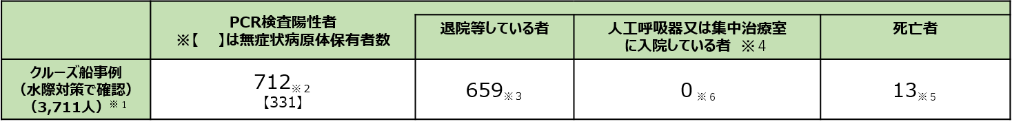 ※2 船会社の医療スタッフとして途中乗船し、PCR陽性となった1名は含めず、チャーター便で帰国した40名を含む。国内事例同様入院後に有症状となった者は無症状病原体保有者数から除いている。