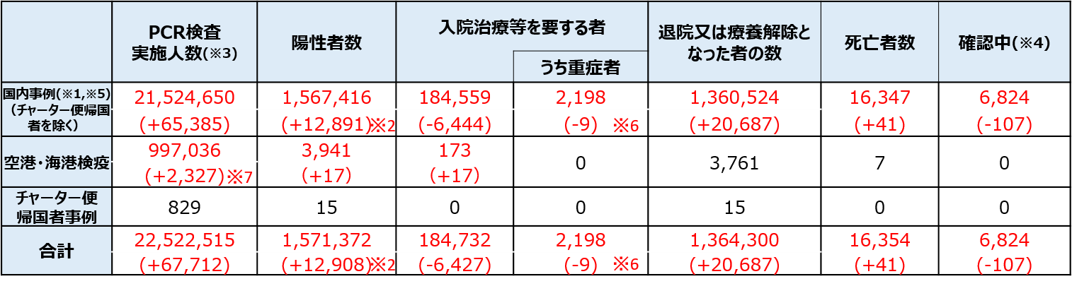※4:PCR検査陽性者数から入院治療等を要する者の数、退院又は療養解除となった者の数、死亡者の数を減じて厚生労働省において算出したもの。なお、療養解除後に再入院した者を陽性者数として改めて計上していない県があるため、合計は一致しない。