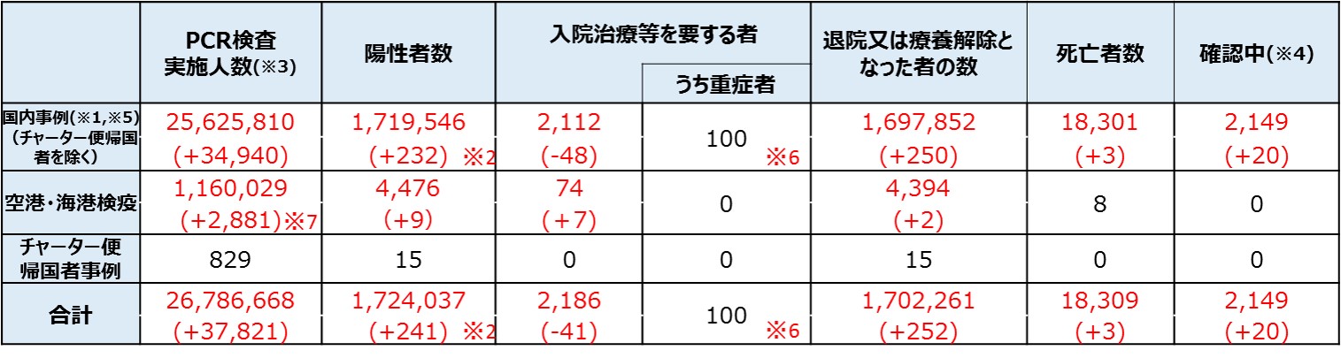 ※4:PCR検査陽性者数から入院治療等を要する者の数、退院又は療養解除となった者の数、死亡者の数を減じて厚生労働省において算出したもの。なお、療養解除後に再入院した者を陽性者数として改めて計上していない県があるため、合計は一致しない。