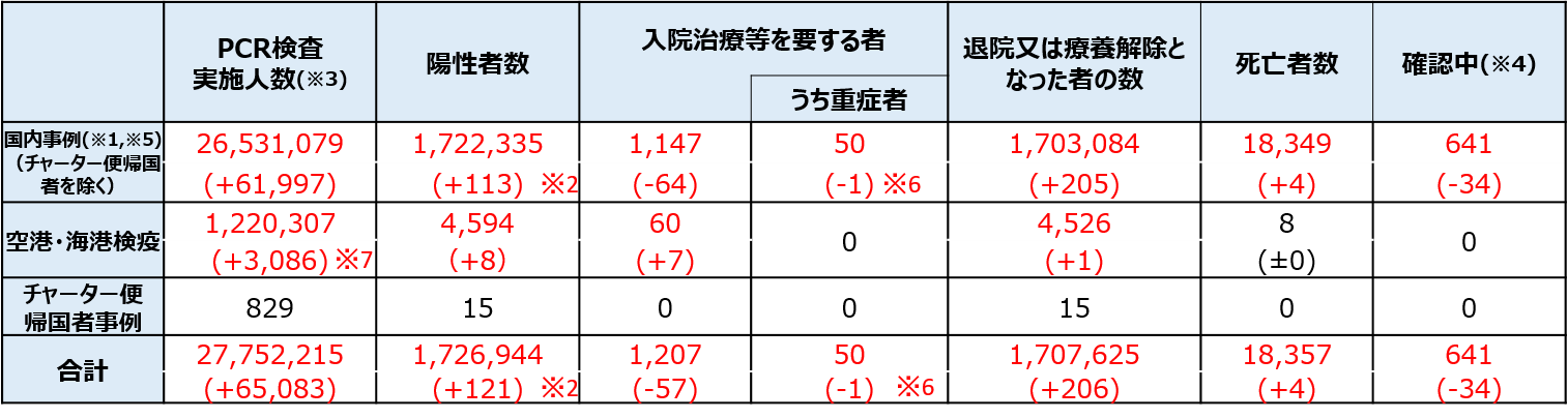 ※4:PCR検査陽性者数から入院治療等を要する者の数、退院又は療養解除となった者の数、死亡者の数を減じて厚生労働省において算出したもの。なお、療養解除後に再入院した者を陽性者数として改めて計上していない県があるため、合計は一致しない。