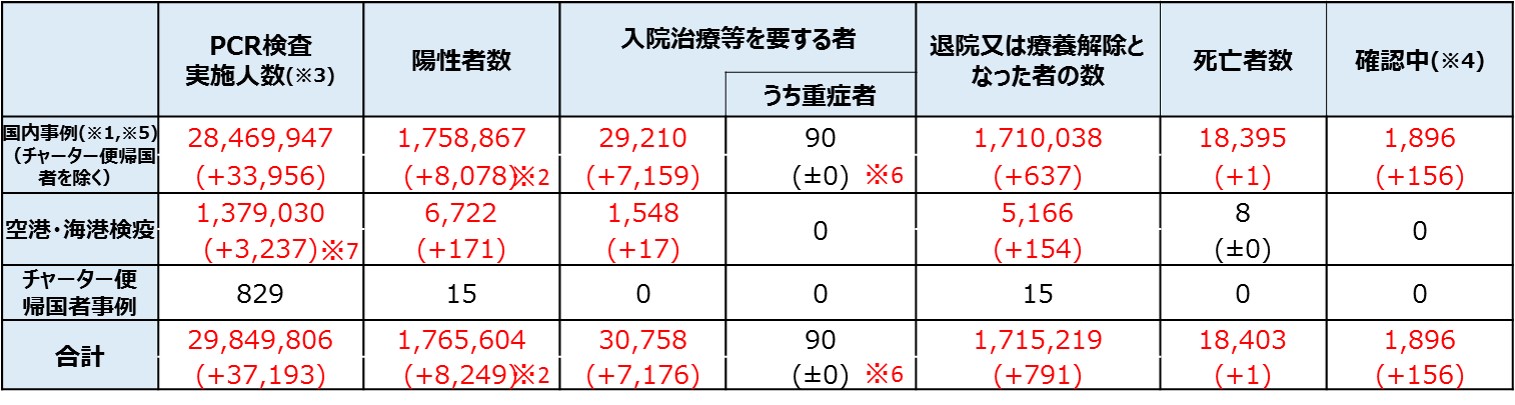 ※7:令和2年7月29日から順次、抗原定量検査を実施しているため、同検査の件数を含む。なお、空港・海港検疫の検査実施人数等については、公表日の前日の0時時点で計上している。