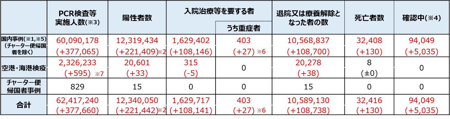 国内での新型コロナウイルス感染症の感染者は12,340,050例、死亡者は32,416名となりました。