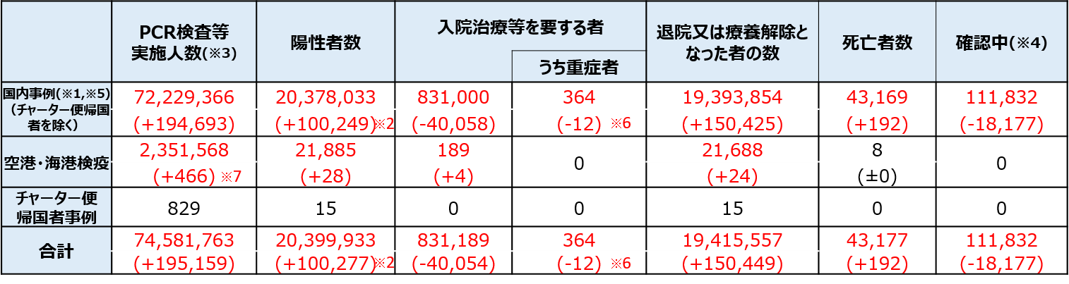 ※2:新規陽性者数は、各自治体がプレスリリースしている個別の事例数(再陽性例を含む)を積み上げて算出したものであり、前日の総数からの増減とは異なる場合がある。