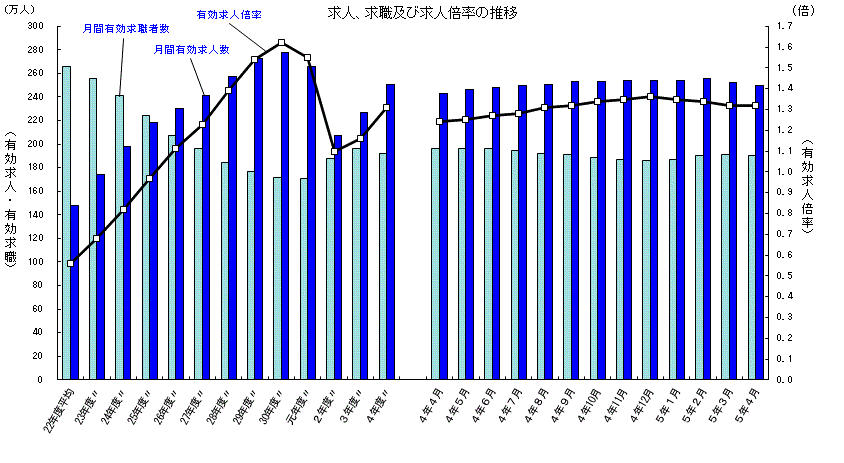 厚生労働省では、公共職業安定所(ハローワーク)における求人、求職、就職の状況をとりまとめ、求人倍率などの指標を作成し、