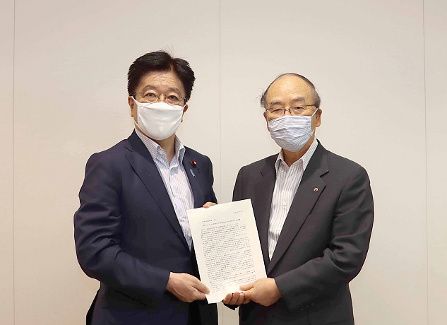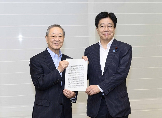 中西日本経済団体連合会会長に要請書を手渡す加藤厚生労働大臣