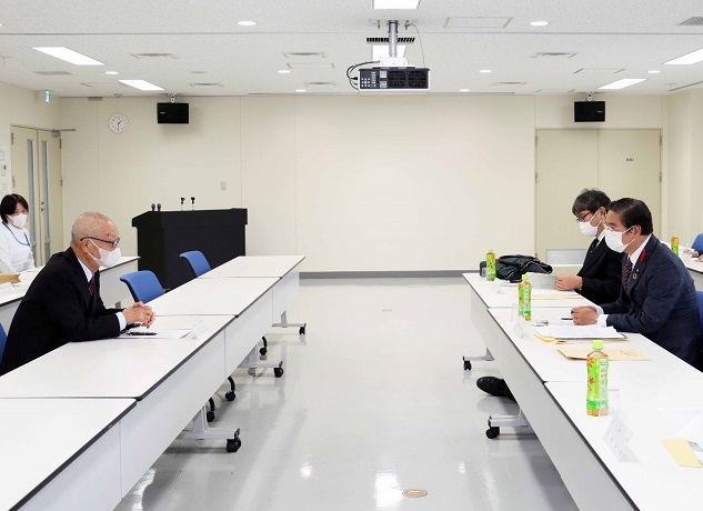 国立療養所多磨全生園で藤崎全国ハンセン病療養所入所者協議会事務局長から説明を受ける山本厚生労働副大臣