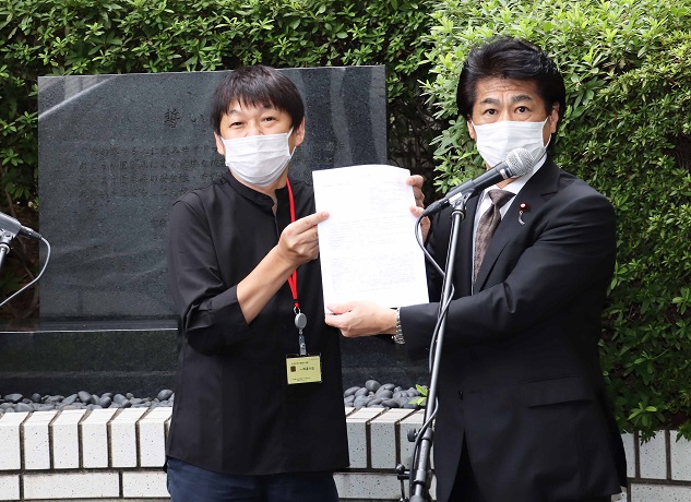 「誓いの碑」の前で、花井 全国薬害被害者団体連絡協議会代表から要望書を受け取る田村厚生労働大臣