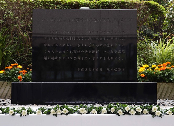 「かつてとられた隔離施策により、多くの患者・元患者の方々が、人権上の制限、差別などを受け平穏に生活することを妨げられたことを深刻に受け止め、改めて、深くお詫びするとともに、多くの苦しみと無念の中でお亡くなりになられた方々に哀悼のまことを捧げます。