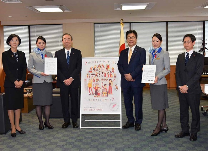 このメッセージは、中央共同募金会会長のメッセージと赤い羽根とともに、ANAグループの客室乗務員の皆さんによって、全国32カ所のANAグループの就航地の現地の知事や市町村長、共同募金関係者に伝達されました。
