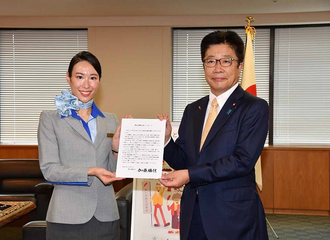 加藤厚生労働大臣は、この式典に出席し、ANAグループの客室乗務員に、赤い羽根共同募金運動へのご支援やご協力をお願いする厚生労働大臣のメッセージを手渡しました。