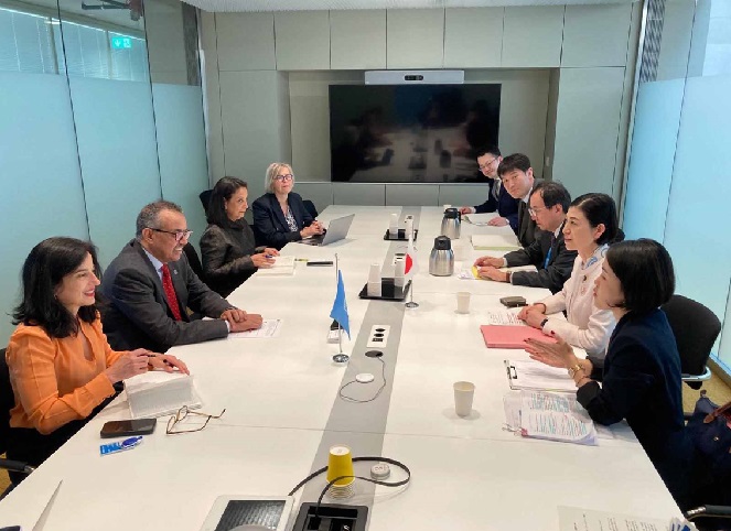 テドロス・アダノム世界保健機関(WHO)事務局長と会談する本田厚生労働大臣政務官