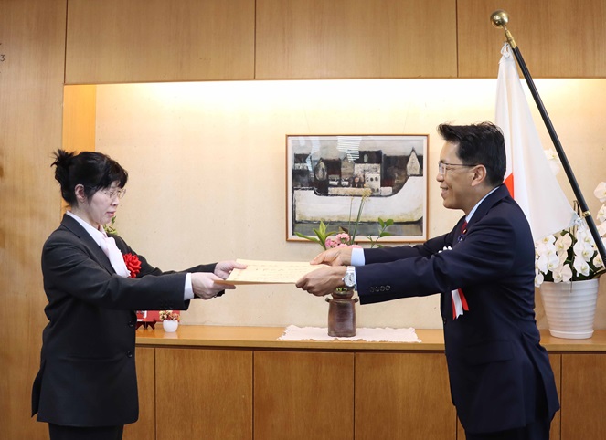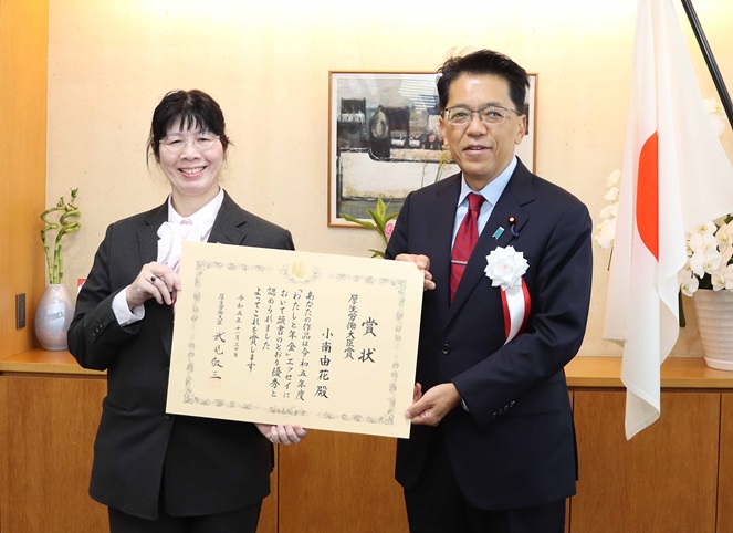 厚生労働大臣賞を受賞した小南さんに表彰状を授与する宮﨑厚生労働副大臣