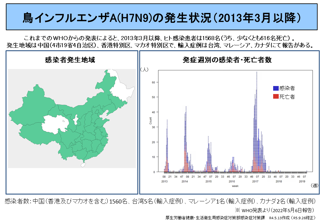 鳥類では中国及び香港において感染が確認され、ヒトでの症例は中国において報告されています。
