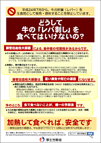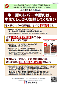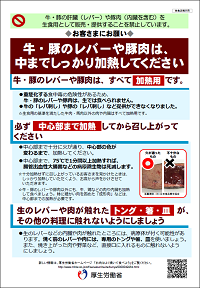 厚生労働省では、食品衛生法に基づき牛の肝臓を加熱して提供すること、販売する際には加熱が必要な旨の情報提供を行うこと、また、生で販売する場合は生食用として販売してはならない旨を規定しています。
