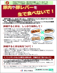 また、豚レバーを生で食べると、サルモネラや、カンピロバクター・ジェジュニ/コリ等の細菌による食中毒のリスクがあるほか、世界では、豚からの有鉤条虫、旋毛虫等の寄生虫への感染も報告されています。
