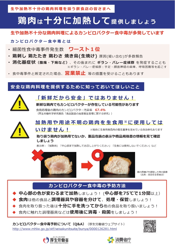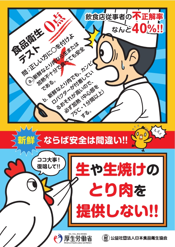 鶏レバーやささみなどの刺し身、鶏肉のたたきなど半生又は加熱不十分な鶏肉料理によるカンピロバクター食中毒が多発しています。