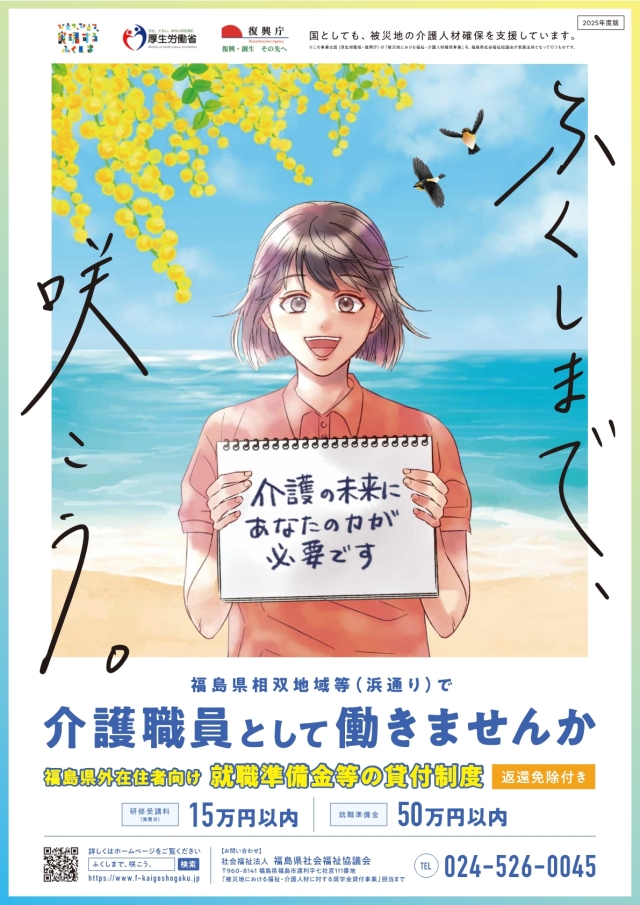 東日本大震災によって甚大な被害を受け、福祉・介護人材の確保が特に困難となっている福島県相双地域等における介護人材の確保に資する施策の一つとして、当該地域で就労意欲のある者に対して一定の条件を満たした場合に返還を免除する奨学金(介護職員初任者研修等の受講料及び就職準備金)の貸与等を行う。