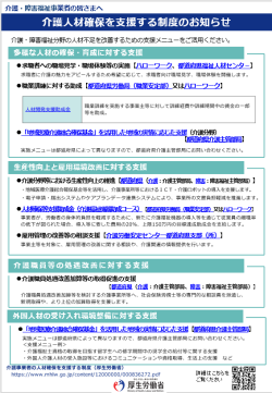 本ページは介護・障害福祉分野への就職・転職をお考えの皆さまと介護・障害福祉事業者の皆さまに向けて、就職等の支援メニューや人材確保を支援する制度をご案内するものです。詳しくは下記のチラシをクリックしてください。※チラシ内のリンクから各事業のホームページ等に移動できます。