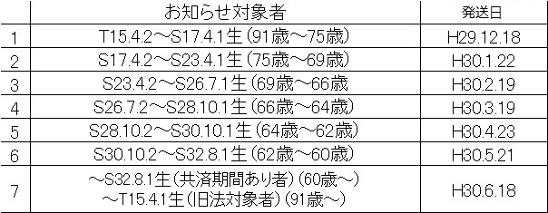 対象者の方には、平成29年2月末から平成29年7月までの間に日本年金機構から「年金請求書(短縮用)」をお届けしています。※厚生年金保険の加入期間が1年以上ある場合は60歳(男性は62歳)以上65歳未満
