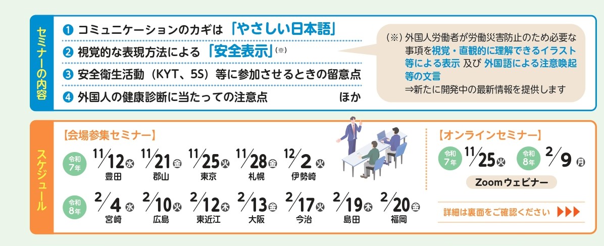 ※事業者向けに、外国人労働者の安全衛生管理のポイントを解説する外国人労働者安全衛生管理セミナー(無料)を開催します。令和7年度の開催予定が決まりましたら本ページでご案内いたします。
