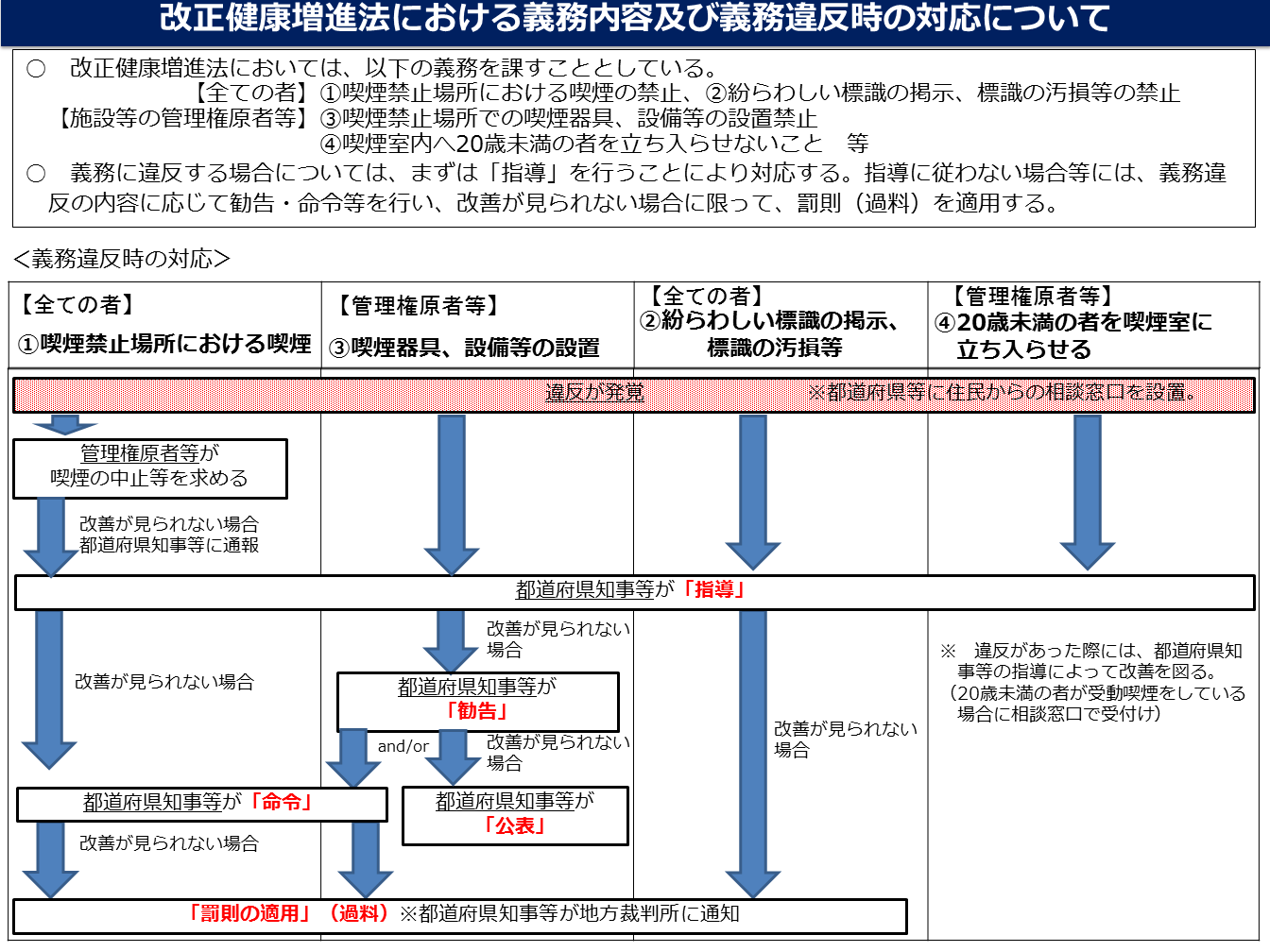 改正健康増進法における義務内容及び義務違反時の対応について